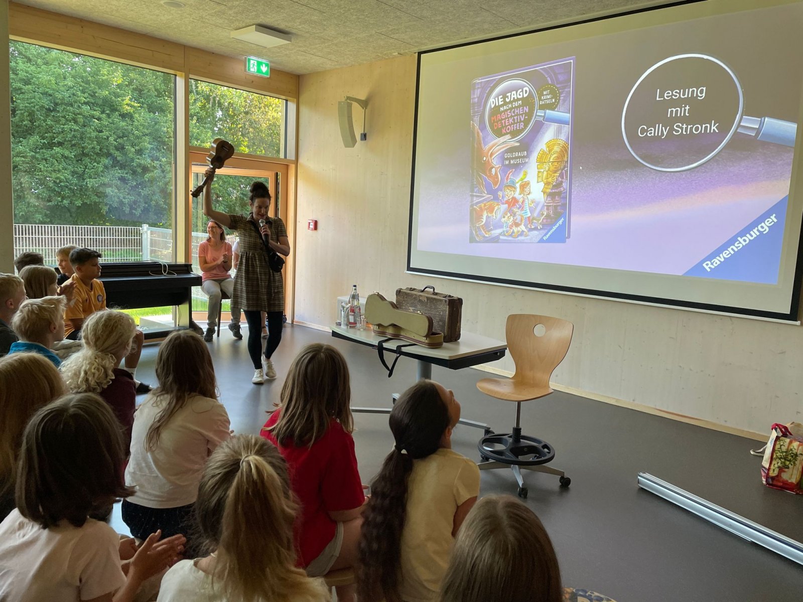 Habt ihr schon einmal vom trojanischen Mammut gehört? Kennt ihr die Besonderheit des magischen Stiftes? Wer sind Pfötchen, Brötchen und Sokrates und was hat es mit Kommissar Schnarch auf sich? Wer das wissen möchte, frägt am besten die Kinder der Teuringer-Tal-Schule. Die sind am Freitag, 14.7.23 nämlich alle zu Superdetektiven ausgebildet worden und zwar von Cally Stronk höchstpersönlich. Sie ist die Autorin der Reihe „Die Jagd nach dem magischen Detektivkoffer“ und hat unsere Grundschüler mit auf den „Goldraub im Museum“ genommen. Mithilfe der Kinder wurden eifrig Rätsel gelöst, gesungen, vorgelesen und visuell eine Reise durch die Geschichte gemacht. Alle waren mit Feuereifer dabei und lauschten angestrengt den Ausführungen der Autorin. Doch wer wissen möchte, ob der Goldschatz am Ende wirklich sicher versteckt war und ob die Ganoven tatsächlich überführt werden, der muss dann doch selber noch zum Buch greifen.