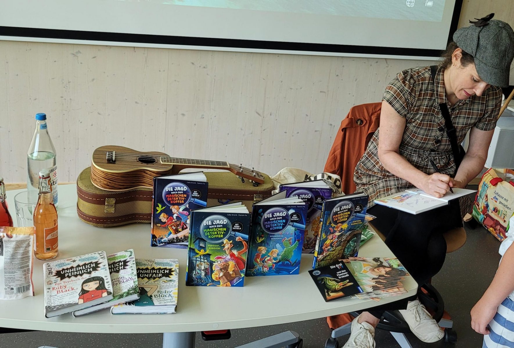 Dafür sind die Kinder aber noch eine ganze Menge Fragen losgeworden. Wie wird man denn eigentlich Autorin? Woher kommen einem die Ideen? Wie viele Kinderbücher hat sie schon geschrieben und welches war ihr erstes? Wie lange braucht sie für eine Geschichte und hat sie auch ein Haustier? Fragen über Fragen, die Cally Stronk geduldig beantwortete. Allen Kindern, die ein Buch von ihr dabei hatten oder über den organisierten Büchertisch gekauft hatten, signierte sie dieses als krönenden Abschluss mit einer persönlichen Widmung.