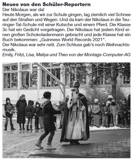 Am 07.12.2020 war es soweit: Das erste Projekt des Fördervereins konnte umgesetzt werden: Der Nikolaus besuchte die Teuringer-Tal-Schule! Standesgemäß wurde er mit einer Kutsche zur Schule chauffiert. Nach einer kleinen Ansprache lauschte er den toll vorbereiteten Liedern und Gedichten der Schüler und verteilte anschließend die mitgebrachten Geschenke. Jede Klasse erhielt ein Säckchen mit Schokoladen-Nikoläusen für die Kinder sowie einem besonderen Buch für die Klasse, das sich die Klassenlehrerinnen im Vorfeld wünschen durften.