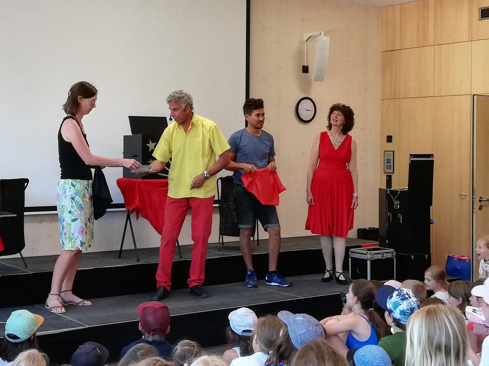 Nach dem ökumenischen Gottesdienst gab es weitere Führungen, Ausstellungen (z.B. Bilderfilme zur TTS), Mitmach-Aktionen (u.a. die Gestaltung von Gute-Wünsche-Händen für die Schule oder ein Mini-Fußball-Match, bei dem Gemeinderät*innen gegen Kinder spielten), Schönes zum Anschauen und Zuhören (der Musikverein und der Schulchor sorgten für Unterhaltung, außerdem wurde beispielsweise ein Kamishibai-Bildertheater aufgeführt) sowie verschiedene Spielestationen des Lehrerkollegiums und des Betreuungsteams. Highlight waren außerdem die Auftritte des vom Förderverein engagierten Künstlerpaars „Duo Chicago“ aus Lindau, das mit viel Humor und Charme eine Mischung aus Artistik, Comedy und Zauberei präsentierte und dabei Kinder als auch Erwachsene gleichermaßen zum Lachen und Staunen brachte. Zwischen den beiden Vorstellungen konnte das eigene Geschick beim Mitmachzirkus unter Beweis gestellt werden.