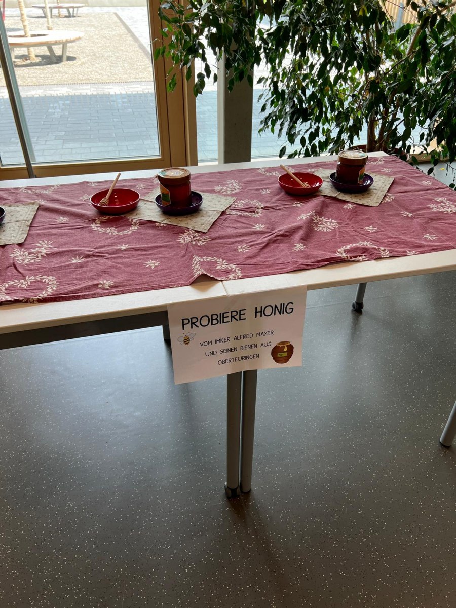 Im Rahmen des Nachmittagsunterrichts gab es eine Honig-Probier-Station, für die beim Imker einige Gläser Honig gekauft wurden, den sich die Kinder auf den mitgebrachten Broten schmecken ließen. Ein besonderer Dank geht hierfür an den Imker Alfred Mayer, der an dem Nachmittag mit seinem Schaubienenvolk vor Ort war, spannendes Anschauungsmaterial dabeihatte und alle Fragen der Kinder und Lehrerinnen beantwortet hat.